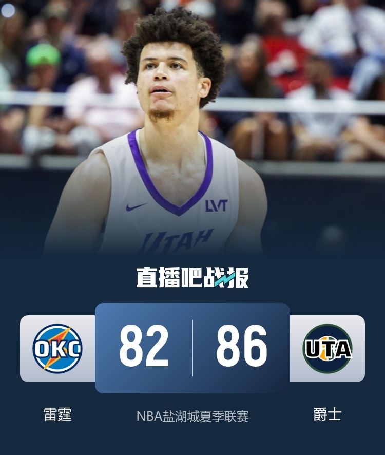 上半场,双方开场势均力敌,比分始终紧咬,米切尔内外开花连得5分,爵士轮番冲击内线频频得手给出回应,次节雷霆命中率骤降,爵士趁机打出7-0反超比分,米切尔攻防两端立功稳住局势,爵士大举进攻再度完成10-0的攻势以39-36领先结束第二节。下半场,双方继续缠斗,雷霆突然哑火,爵士4分钟轰出20-0的进攻狂潮确立优势,末节雷霆奋力反击,多点开花打出17-4的攻击波迅速迫近比分,莱昂斯连得5分率队打出8-2反超比分,双方争夺陷入白热化,关键时刻爵士连中三分打出7-0锁定胜局。最终,爵士86-82力克雷霆。