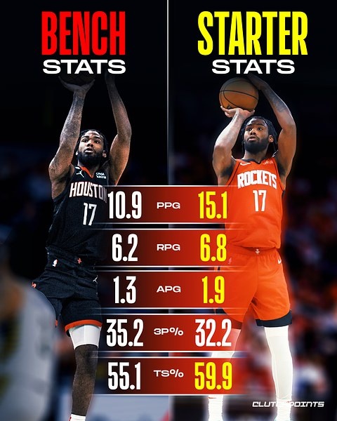 9月30日讯 美媒Clutchpoints晒出了火箭球员塔里-伊森上赛季打先发和打替补时的数据对比。