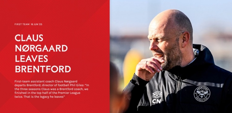 一线队助理教练克劳斯-诺尔高已离开布伦特福德。