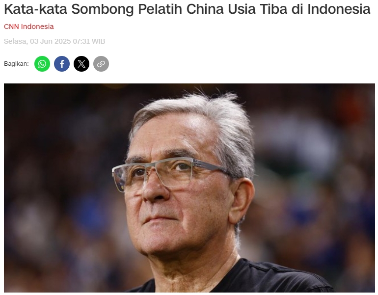 对此,印尼媒体CNN Indonesia以“中国队主教练抵达印尼后放狂言”为题发文,全文如下: